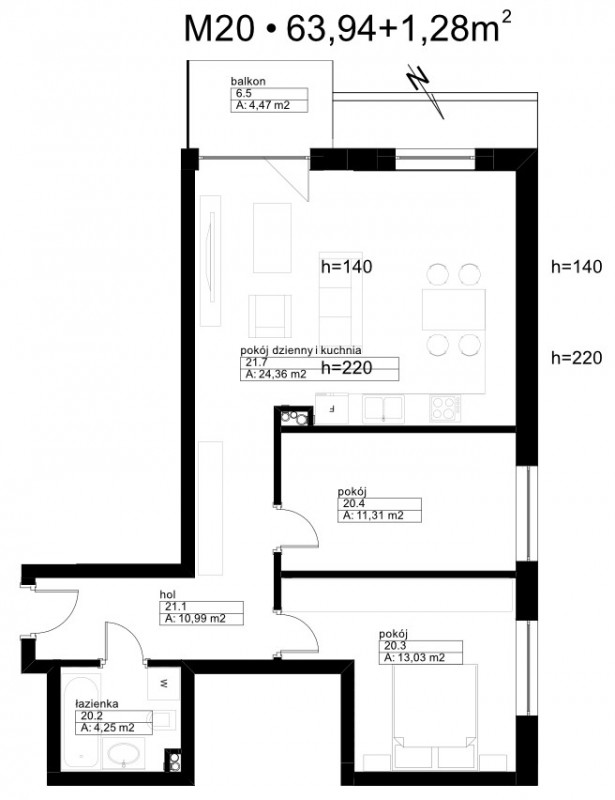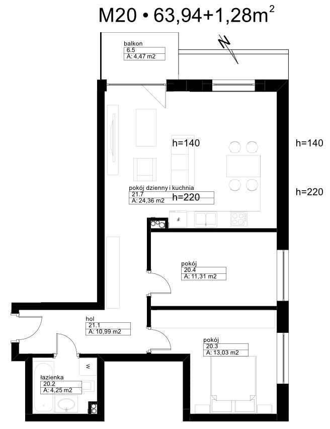 | Pokój dzienny i kuchnia: | 24.36 m²