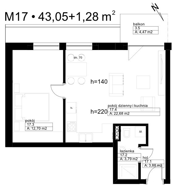 43.05 + 1.28 m²