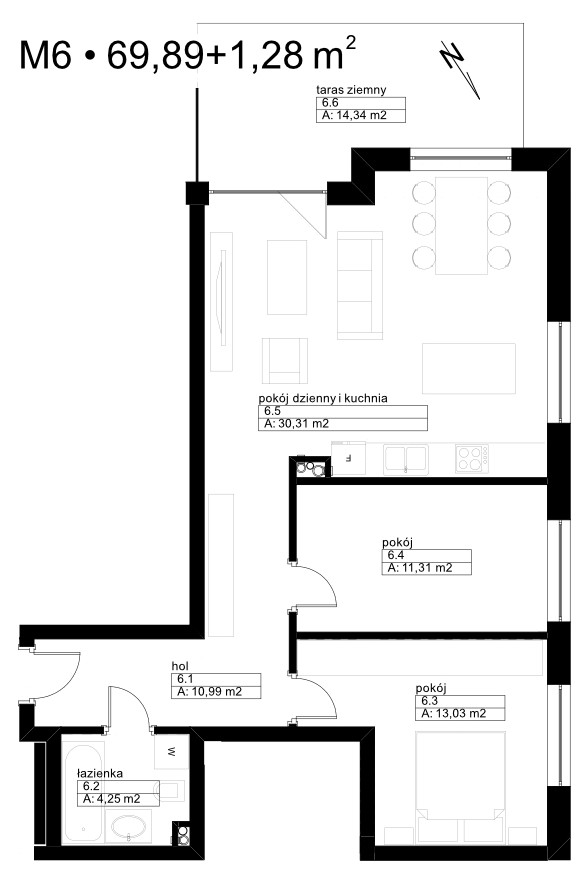 Powierzchnia mieszkania: 69.89 + 1.28 m²