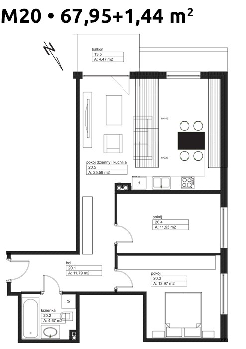 Powierzchnia mieszkania: 67.95 + 1.44 m²