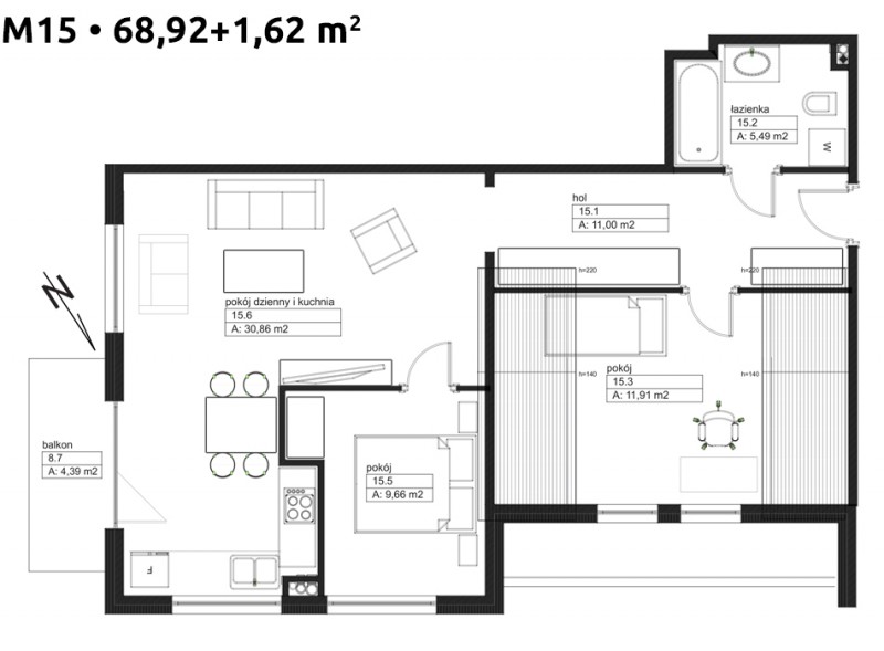 Powierzchnia mieszkania: 68.92 + 1.62 m²