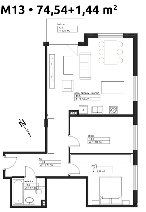 | Pokój dzienny i kuchnia: | 32.18 m² |